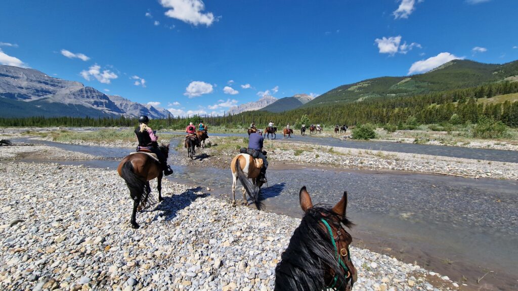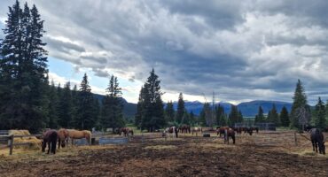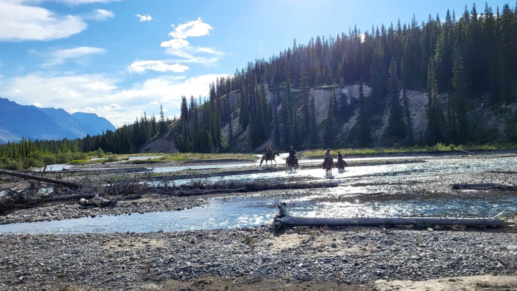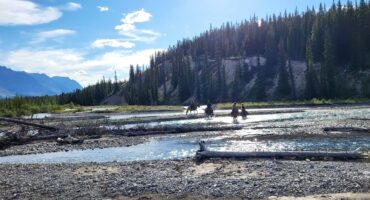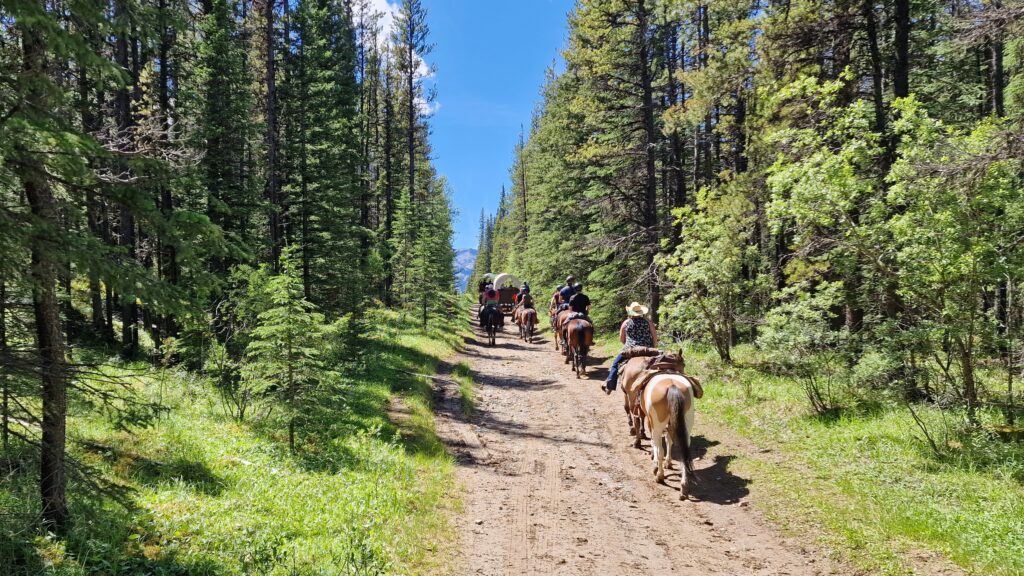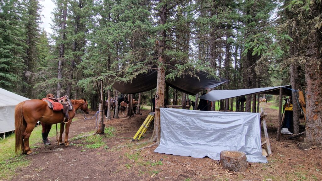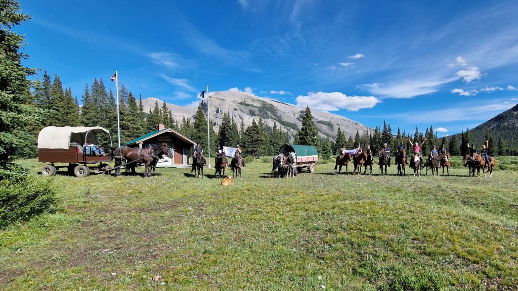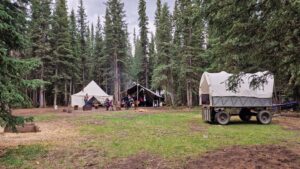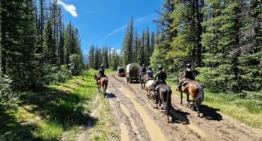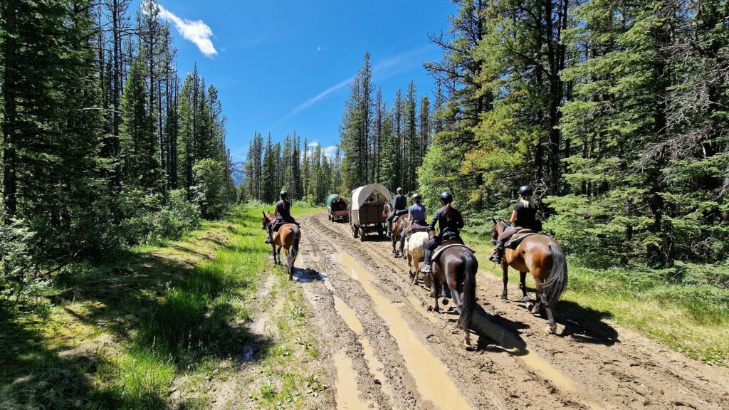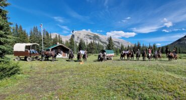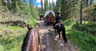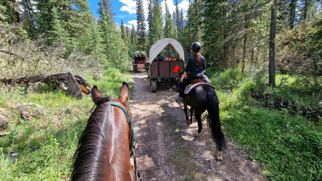 Na kolejne dni przeniesiemy się nieco na północ by dołączyć do wozów konnych zaprzyjaźnionej ekipy z Clearwater Basin. Podążając za nimi dotrzemy do niezwykłego obozowiska w dziczy. Gospodarze tego zjawiskowego miejsca otwierają swoją bazę w okolicach maja – często jeszcze w śniegu – przywożąc wszystko konnymi wozami. Obóz zwijają jesienią, w okolicach Święta Dziękczynienia, również wywożąc cały sprzęt wozami. Miejsce jest przepiękne i szalenie ciekawe, a nasi gospodarze – koniarze z krwi i kości – uwielbiają gościć innych jeźdźców.