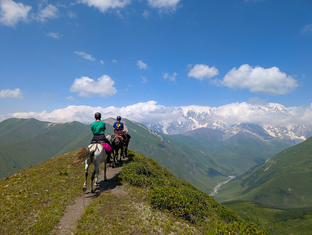 „Lodowce Gruzji” przygotowaliśmy z myślą o jeźdźcach mających już doświadczenie rajdowe w górach. Wyprawa jest, jak na nasze możliwości :), relatywnie krótka, ale każdy z tych dni jest dość intensywni i pełen wrażeń. Każdy z trzech dni w siodle w Swanetii podąża przepięknymi i zachwycającymi, acz nieco wymagającymi szlakami. Dotrzemy konno na niemal 3000 metrów, wdrapiemy się na „dach Gruzji” i staniemy u czoła lodowca. Z siodła i z wysokości podziwiać będziemy majestat gór Szchara, Tetnuldi i Uszba.
