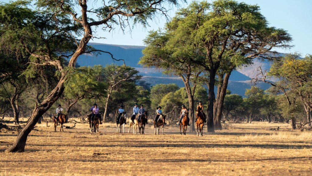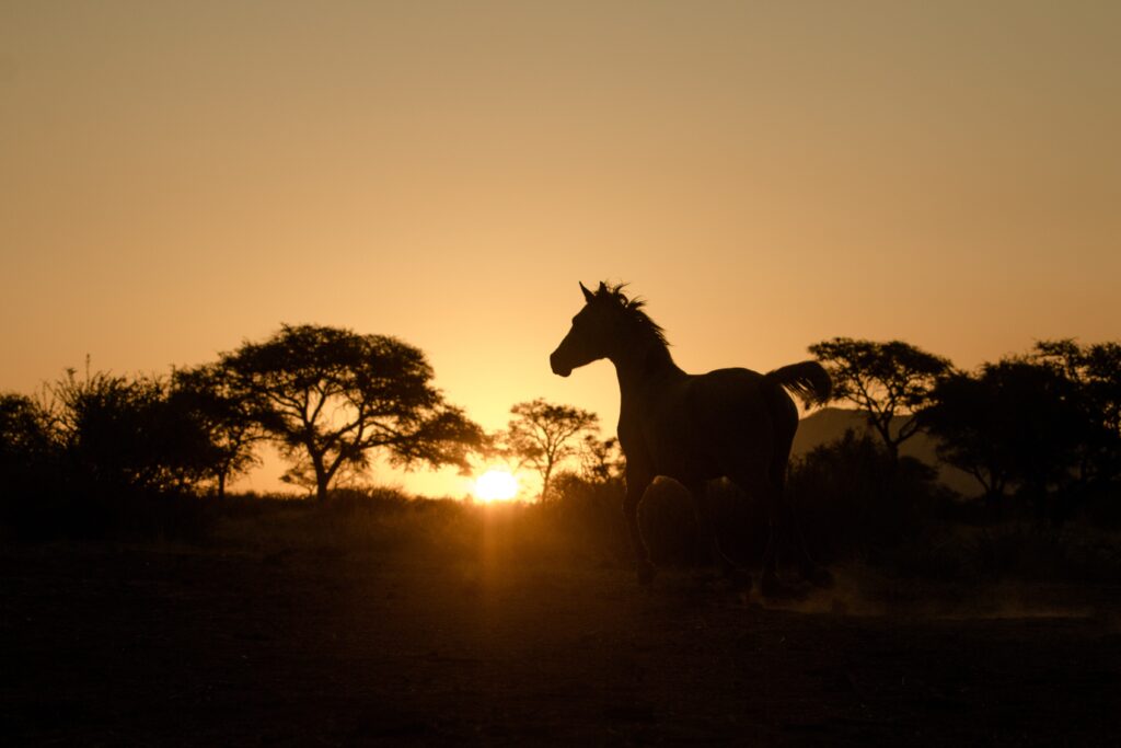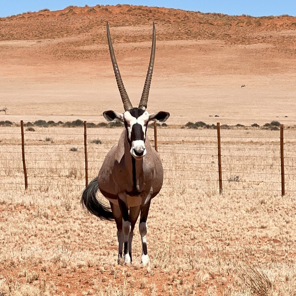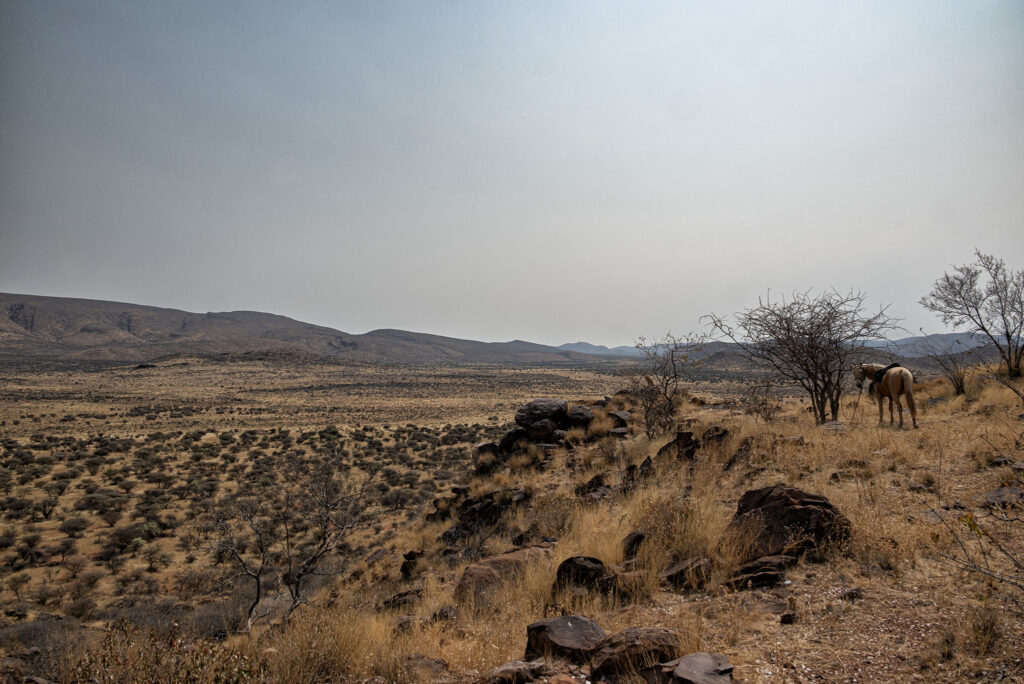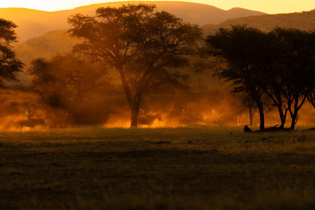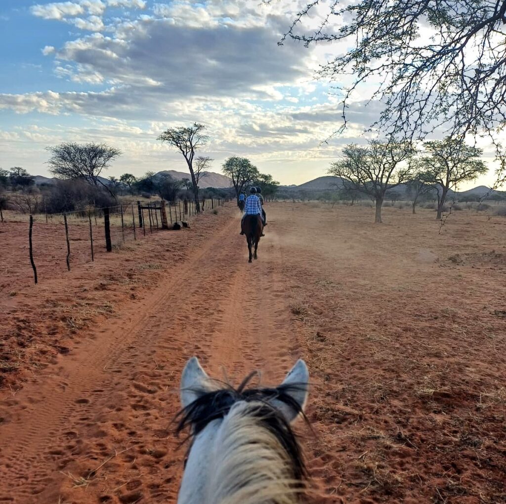 Pierwsze cztery dni w Namibii spędzimy na sporych rozmiarów rodzinnej farmie, na której czterdzieści koni stanowi najmniej egzotyczną część miejscowego okolicznego świata zwierząt. Na obszarze pokaźnego, liczącego 11 000 hektarów, terenu mieszka bezlik zwierząt. Oprócz koni i zwierząt domowych na farmie hodowane jest bydło rasy Simental, bardzo rozpowszechnionej w Europie, choć w Polsce mało popularnej. Przede wszystkim jednak gospodarstwo jest domem wielu zwierząt egzotycznych, które oglądać i podglądać będziemy z siodła. Na rozległym obszarze spotkać można żyrafy, antylopy, zebry, oryksy – narodowy symbol Namibii, (trochę wredne) strusie czy guźce, na których jamy trzeba uważać jadąc konno po niektórych częściach farmy. W okolicy występują też przeróżne jaszczurki, niewielkie ssaki, mniejsze kotowate, szakale, pawiany, a przy odrobinie szczęścia czasami udaje się wypatrzeć lamparty.