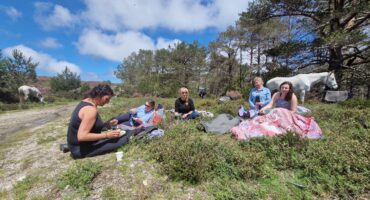Pierwszą część dnia przeznaczymy na zwiedzanie. Po śniadaniu wybierzemy się pieszo do Entrimo, gdzie zobaczymy barokowy Kościół Matki Bożej Królewskiej z XVIII wieku. Następnie pospacerujemy uliczkami miasteczka i zatrzymamy się w lokalnym barze na pyszną kawę – polecamy carajillo con ron. 🙂 Po krótkim odpoczynku pojedziemy do term Rio Caldo w Lobios, by rozgrzać ciało i przygotować mięśnie do wieczornej jazdy. Choć na pierwszy rzut oka mogą wydawać się niepozorne, woda w niektórych miejscach jest naprawdę gorąca. Po kąpieli udamy się do pracowni Antonio „Toño” Monteiro, galicyjskiego rzeźbiarza, którego sztuka często nawiązuje do natury i krajobrazów regionu Xurés. Artysta opowie nam o źródłach swojej inspiracji, pokaże kilka prac, a oprócz uczty dla ducha przygotuje również coś dla ciała – lokalne tapas i własne trunki. Na późny lunch wrócimy do willi, a po posiłku wsiądziemy w siodła. Czeka nas magiczna podróż w świetle księżyca! Około 17:00 ruszymy do stajni, gdzie poznamy nasze konie. Po osiodłaniu rozpoczniemy 3–4 godzinną wędrówkę. Kolacja czeka nas w połowie drogi – w blasku zachodzącego słońca, w urokliwym miejscu nad strumieniem. Po zmroku wyruszymy dalej, a jedynym naszym światłem będzie księżyc odbijający się w tafli jeziora. Około północy, w ciszy i przy stukocie końskich kopyt, dotrzemy do Maus de Salas. Tam rozsiodłamy i nakarmimy konie, zjemy lekką kolację i udamy się na zasłużony odpoczynek.