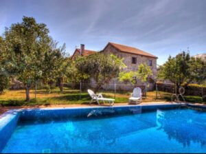 Po niespiesznym śniadaniu osiodłamy konie i ruszamy w drogę. Najpierw jednak napoimy je w jeziorze – uwaga, niektóre mogą nagle zapragnąć kąpieli, zupełnie nie zważając na jeźdźca w siodle. 🙂 Dzisiejszy dystans to ok. 12 km, dlatego pojedziemy bez przerwy na popas. Trasa prowadzi galicyjskimi ścieżkami ukrytymi wśród drzew i krzewów. Wiele odcinków wyznaczają porośnięte mchem kamienne mury i dawne ogrodzenia, które nadają drodze niepowtarzalny charakter. Dojeżdżamy do Porqueirós, gdzie nasze konie zostaną na noc. Po rozsiodłaniu udamy się na lunch – czeka na nas prawdziwa uczta przygotowana przez właściciela lokalnego hoteliku. Smakosze nie będą zawiedzeni: spróbujemy regionalnych specjałów, w tym słynnych przegrzebków, czyli muszli św. Jakuba. Te duże małże w charakterystycznym kształcie wachlarza, są symbolem pielgrzymki do Santiago de Compostela, najsławniejszego miasta w Galicji. Całość uzupełni wyborne wino i aromatyczna kawa, na którą zapewne zajrzą także ciekawscy mieszkańcy, zaintrygowani jeździecką biesiadą. Po lunchu wrócimy busem do willi. Popołudnie spędzimy wedle uznania – spacerując krętymi, stromymi uliczkami Feira Vella albo relaksując się nad basenem. Wieczorem czeka nas kolacja w willi.