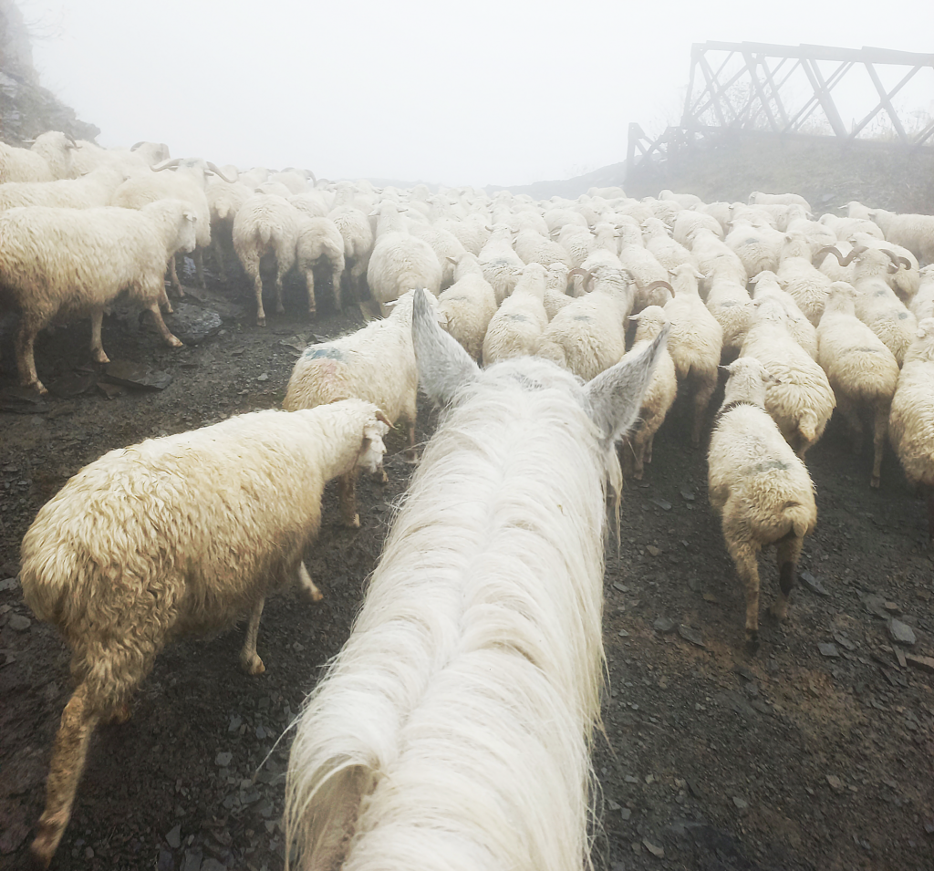Pogoda w październiku jest nieprzewidywalna. Na nizinach i w Tuszetii może być ciągle dość ciepło i słonecznie, ale bardzo prawdopodobnym jest, że stado prowadzić będziemy przez zaśnieżoną i zatopioną w chmurach przełęcz. Jakkolwiek będzie – ruszamy, mamy robotę to zrobienia. 🙂