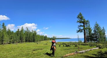 Żegnamy się z pasterzami reniferów i wyruszamy w drogę powrotną. Przed nami kolejny raz tajga. Kierujemy się na południe, w stronę znanego nam już jeziora Tsagaan nuur i przytulonej do jego brzegu osady. To długi odcinek jazdy, około 40 km w trudnym terenie. To także ostatni dzień jazdy konnej. Noc spędzimy w namiotach.